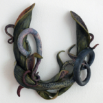 “Enduring,” Fired clay, oxides, mixed media. 14″ x 13.5″ x 3.5″